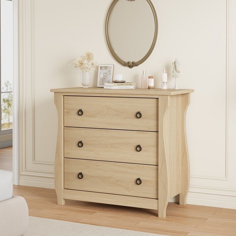 3 Drawer Boho Dresser with Rattan Accents and Curved Legs Compact Storage Cabinet for Bedroom