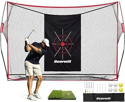 Bearwill Golf Net, 10x7ft Heavy Duty Golf Practice Nets with Mat, Target Cloth, 8 Tees, 6 Balls, Carry Bag for Backyard Driving Chipping Indoor Outdoor Training