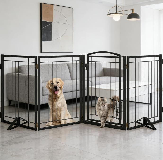 Metal Free Standing Dog Gate with Cat Door, 32" Tall, 80" Extra Wide