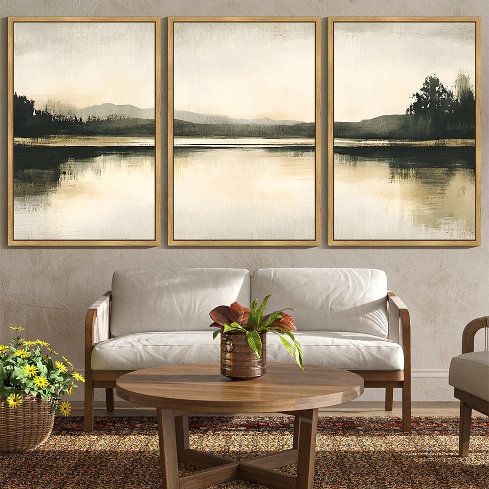 KUVIOKE Watercolor Abstract Mountain Lake Framed Wall Art Brown Landscape Nature Wilderness Painting Nordic Neutral Tan Illustration Decorative Home Decor 24x36in (Natural Framed)