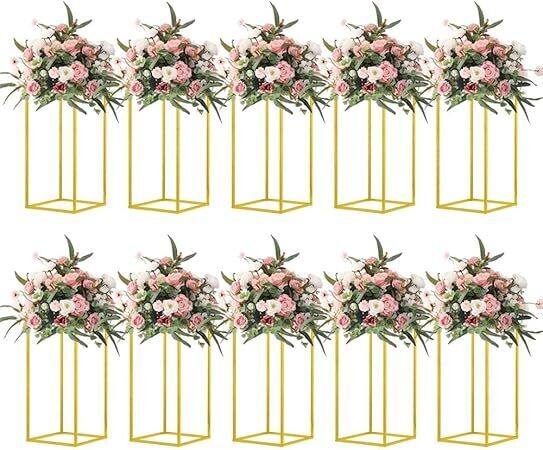 10 Pcs 15.75inch Gold Wedding Flower Vase Metal Column Flower Stand, Geometric Centerpieces Vase for Table, Home Party Wedding Decorations