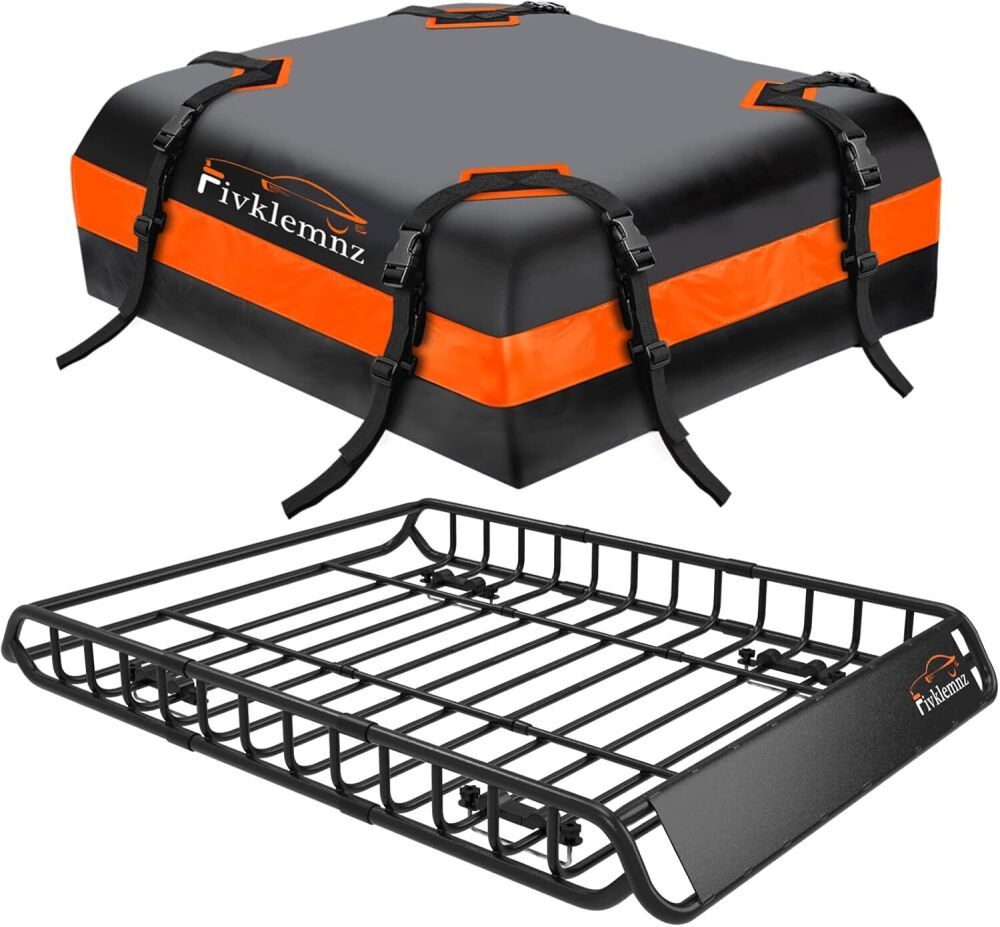 FIVKLEMNZ Roof Rack Cargo Carrier, Universal Roof Basket (49"x 36"x 5") + 15 Cubic Feet Waterproof Rooftop Cargo Carrier Bag (46"x 34"x 17") with Bungee Net, Ratchet Straps, Storage Bag, Luggage Lock