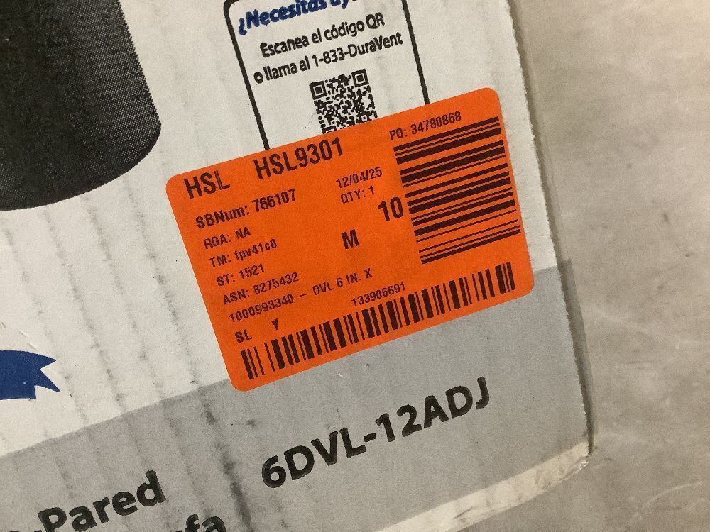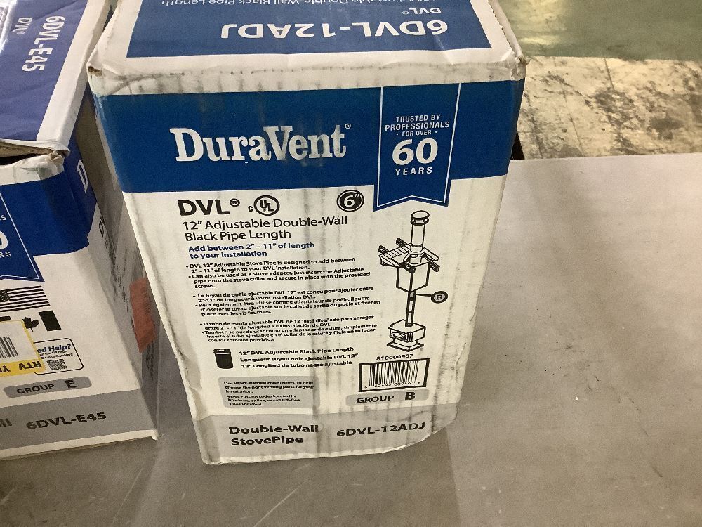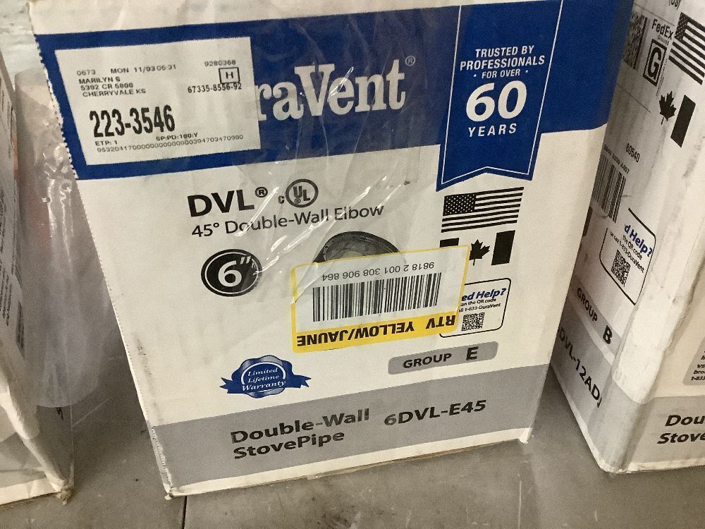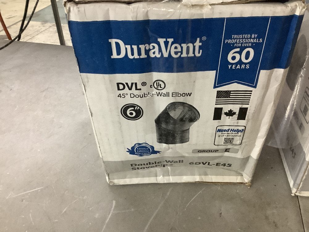 Lot of (2) DuraVent Model DVL Double Wall Stove Pipe 6in. Diameter 45° Double Wall Elbow & (1) DVL Double Wall Stove Pipe 6in. Diameter x 2in. to 10in. Adjustable Stove Pipe Length