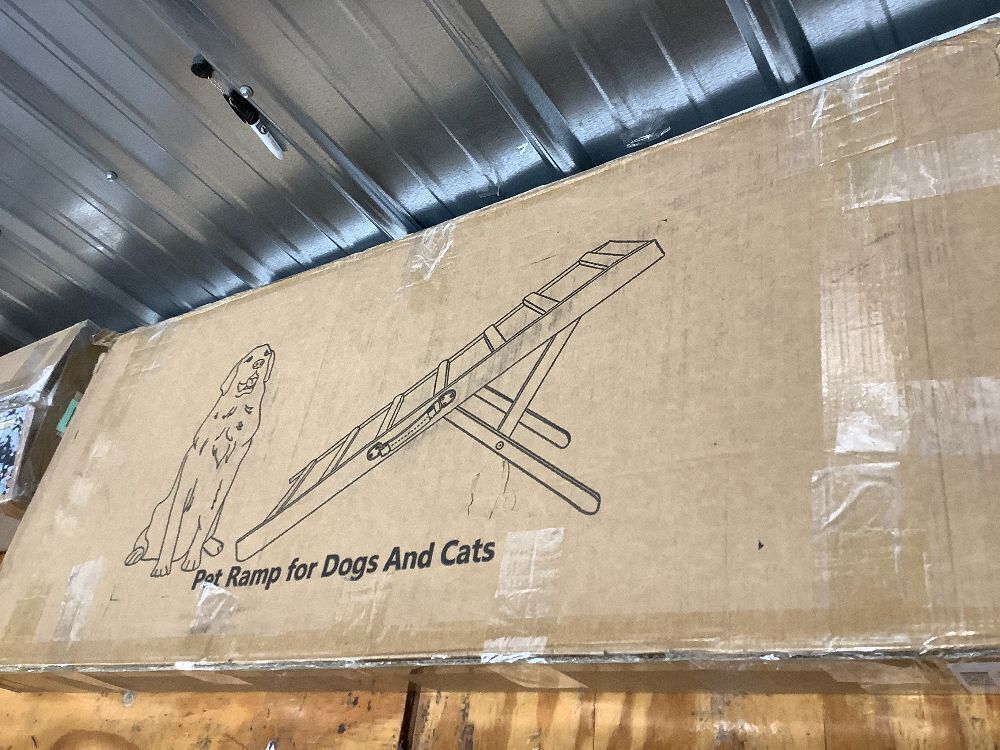 PATHOSIO PETS Adjustable Dog Ramp for Bed - Foldable Wooden Ramp for Dogs to Get on Bed, Couch, or Car with 16.5" Wide Walking Space (Walnut Wood with Gray Carpet, Large)