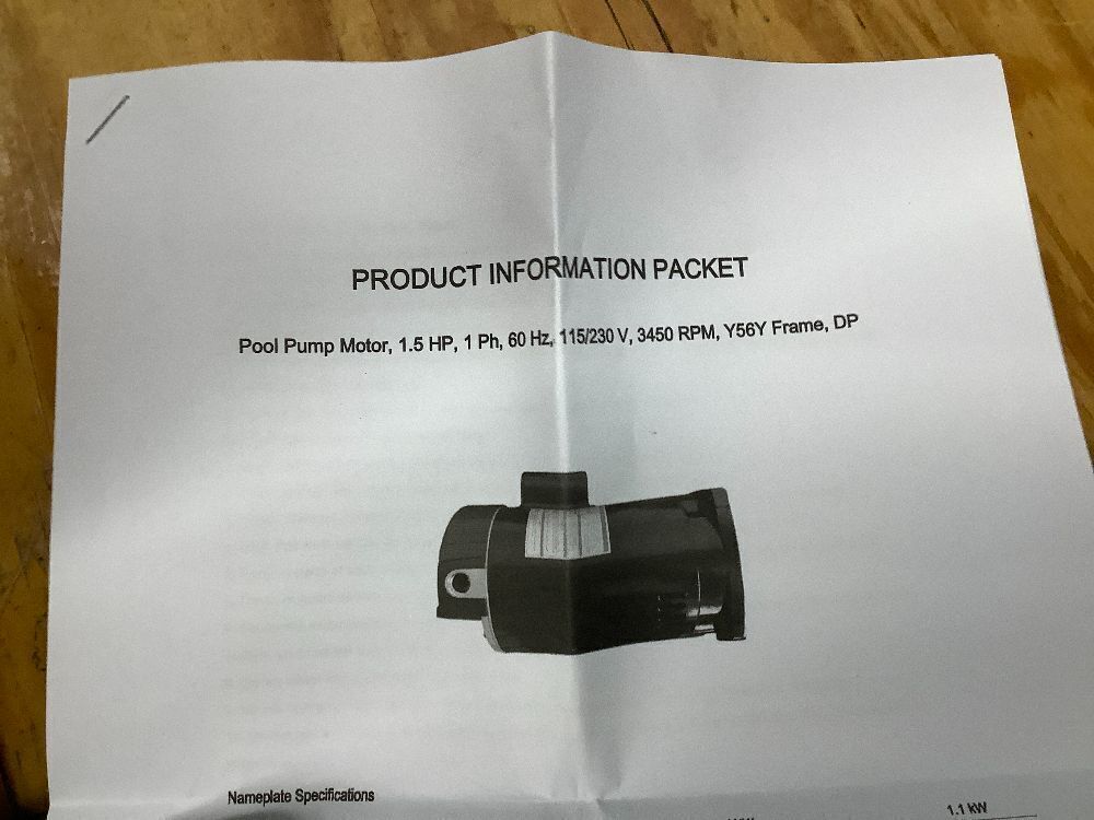 Pool Pump Motor, 1.5 HP, 1 Ph, 60 Hz, 115/230 V, 3450 RPM, Y56Y Frame, DP