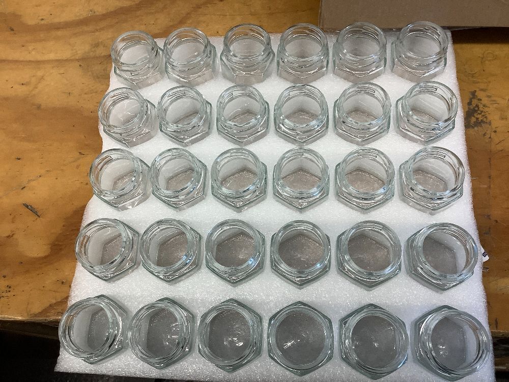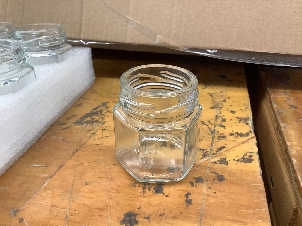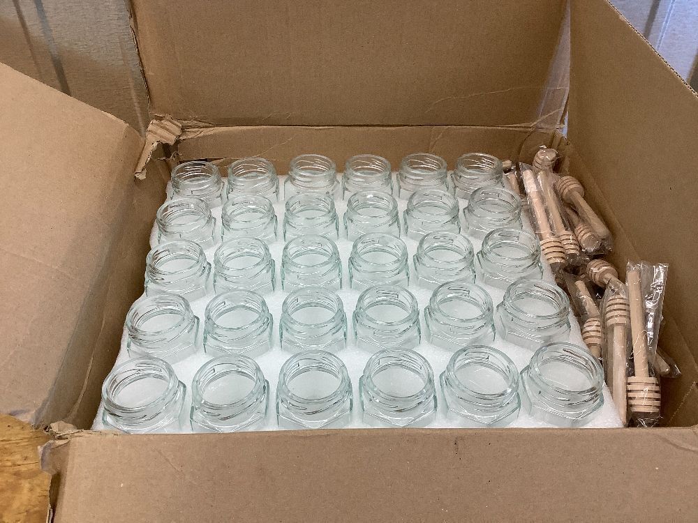 XING-RUIYANG 60 PACK 1.5 oz Mini Glass Honey Jar, Small Hexagonal Honey Jars with Wooden Dipper Gold Lid Bee Charms Gold Gift Bags and Rope for Baby Shower Wedding Party Favors