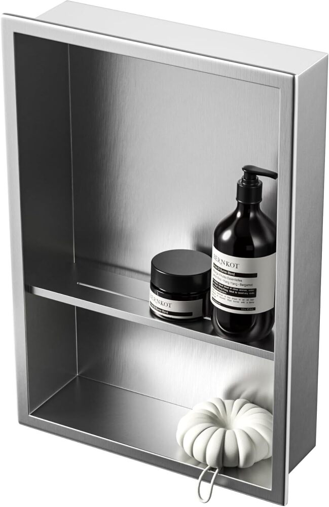 Stainless Steel Shower Niche Brushed No Tile Needed Wall Niche Double Shelves Recessed Shower Shelf for Bathroom Storage Over Mount Installation