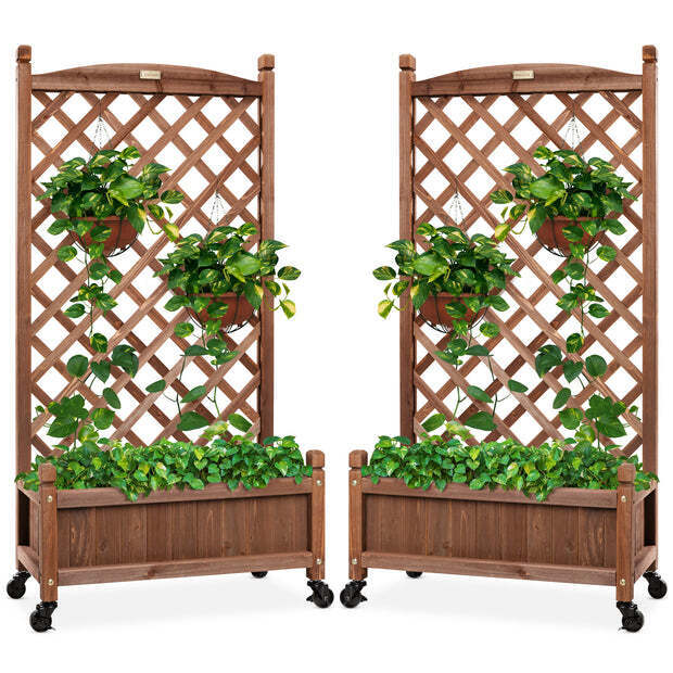 Set of 2 Wood Planter Box & Lattice Trellis w/ Optional Wheels - 48in