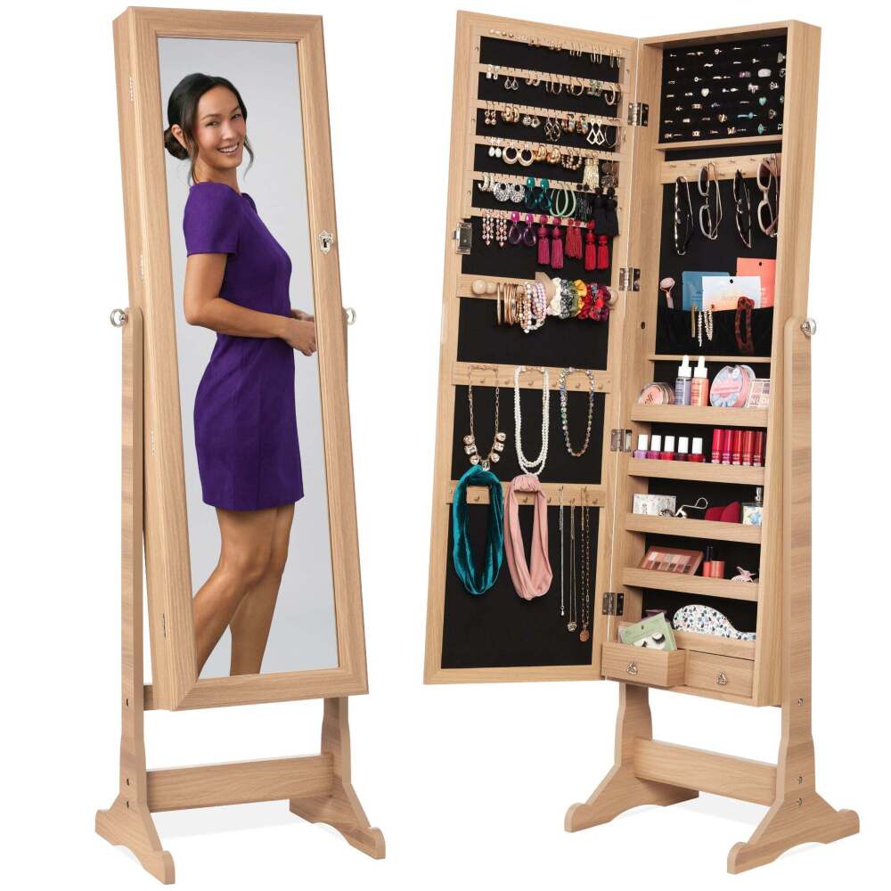 Full Length Freestanding Jewelry Mirror Armoire w/ Velvet Interior