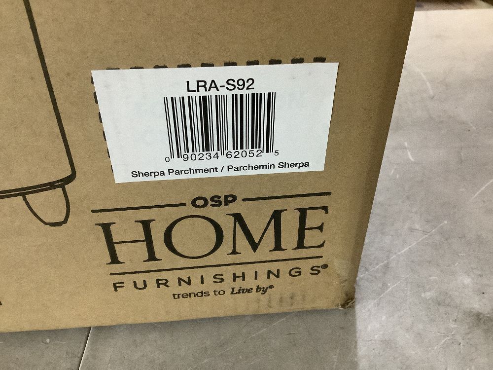 OSP Home Furnishings Lyra Storage Ottoman in Sherpa Parchment Fabric with Medium Oak Legs