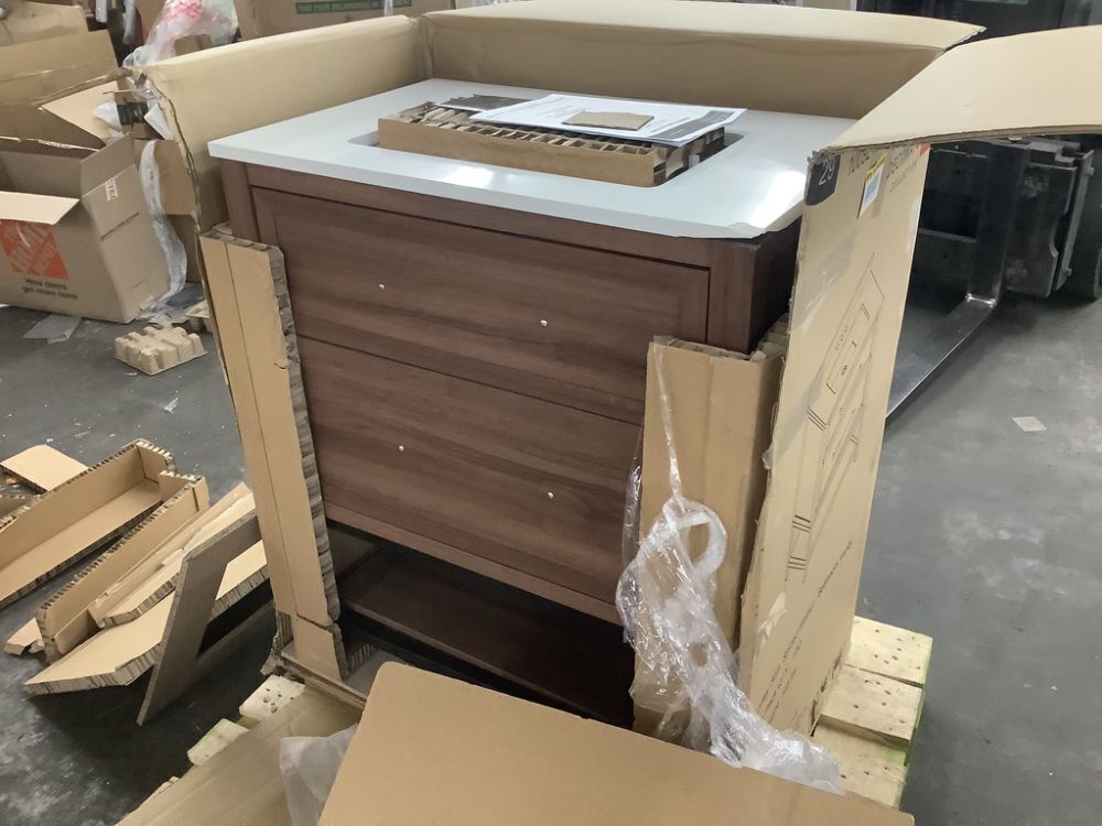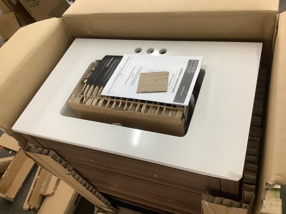 Home Decorators Collection Corley 30 in. Single Sink Spiced Walnut Bath Vanity with White Engineered Stone Top - Damaged Corner
