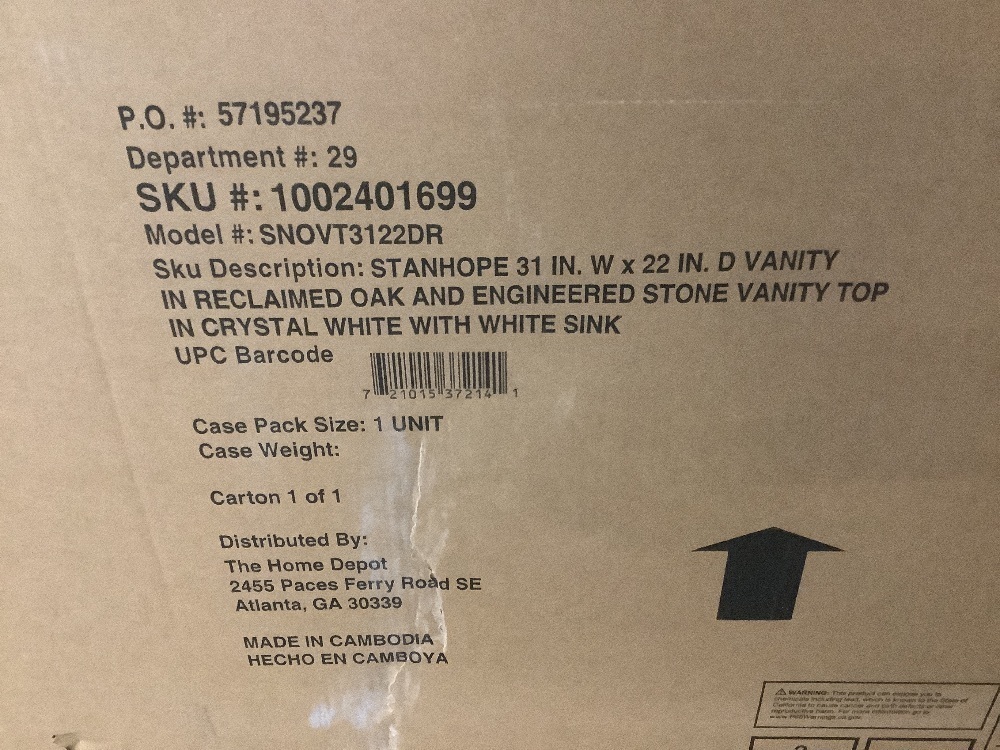 Home Decoratores Collection Stanhope 31 in. Single Sink Reclaimed Oak Bath Vanity with Crystal White Engineered Stone Top (Assembled)Item PropertiesConditionNewRetail Price$1,199