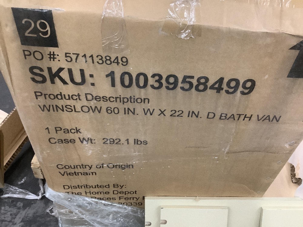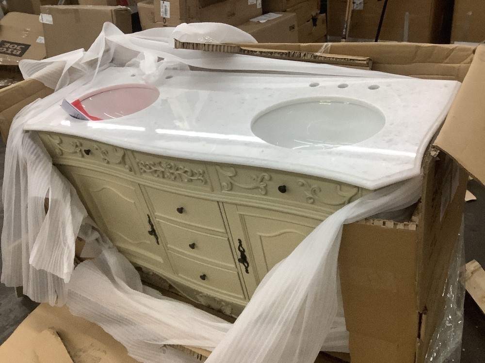 Home Decorators Collection Winslow 60 in. Double Sink Freestanding Antique White Bath Vanity with White Marble Top (Assembled) - Damages ShelvesItem PropertiesConditionAppears New/Cosmetic DamageRetail Price$1,799