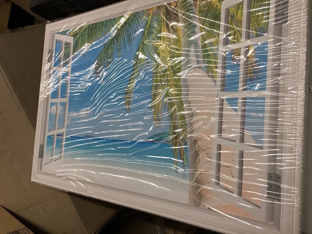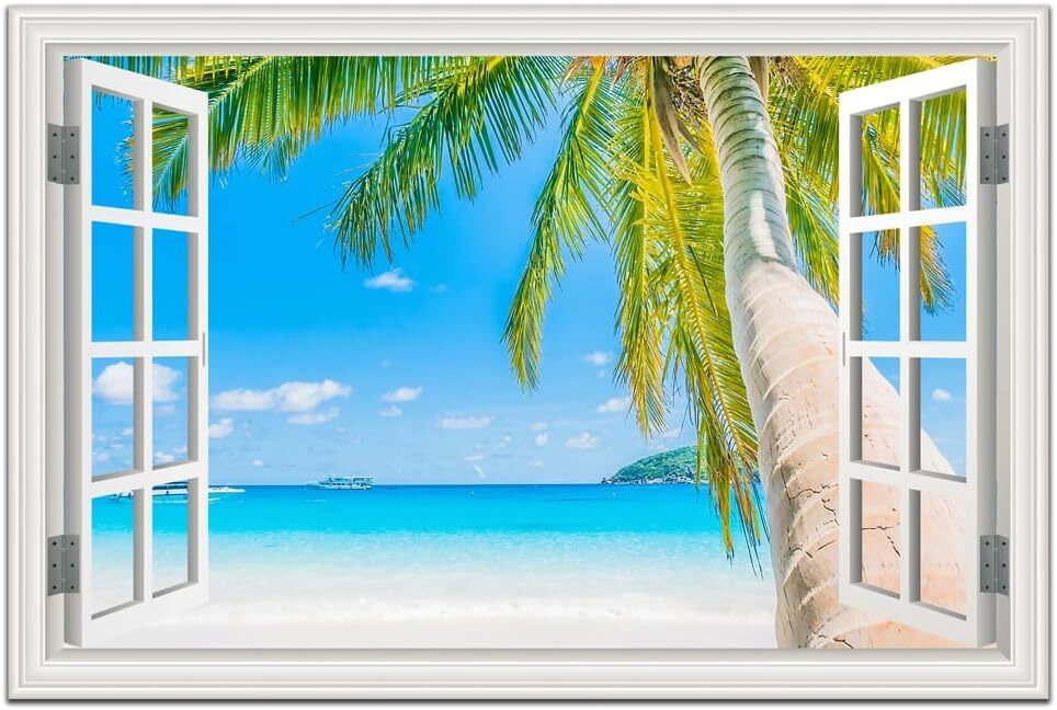 JNMD ART Beach Wall Art Ocean Canvas Pictures Wall Decor Window Frame Style Tropical Palm Tree Artwork Blue Seascape Painting Beach Theme Art Print for Living Room Home Office Decorations